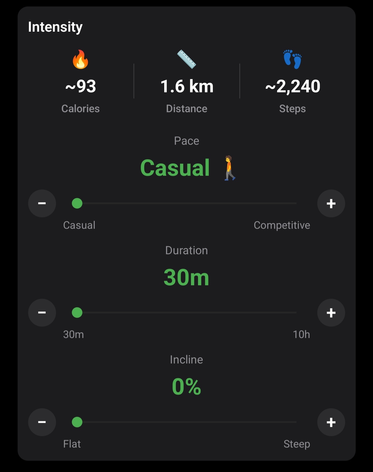 - Pace slider - Casual, Moderate, Brisk, or Competitive
