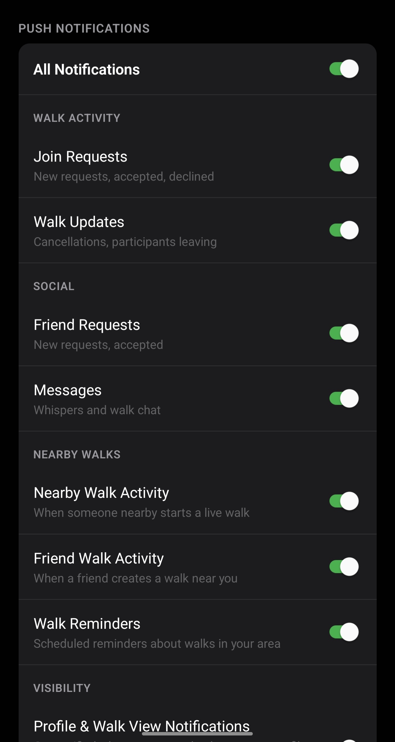 When a walk goes live near your current location, you receive a push notification inviting you to join. Tapping the notification opens the walk card directly.
