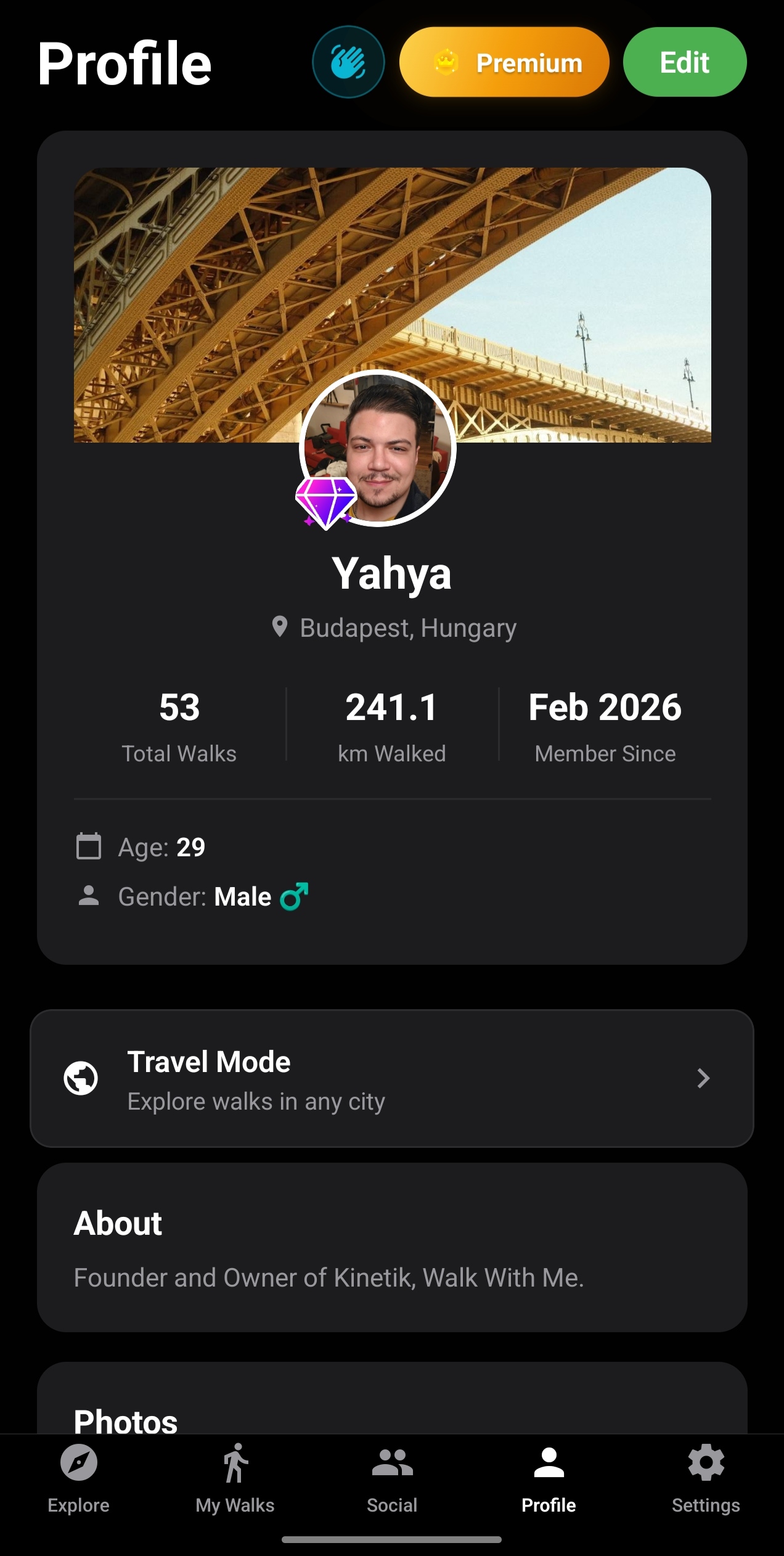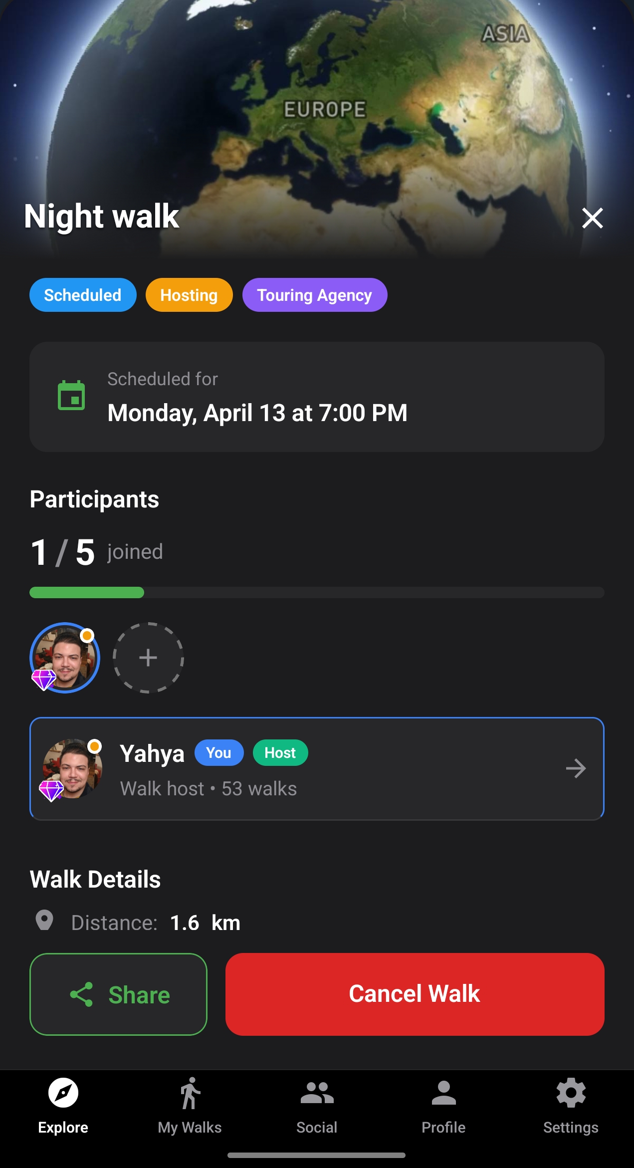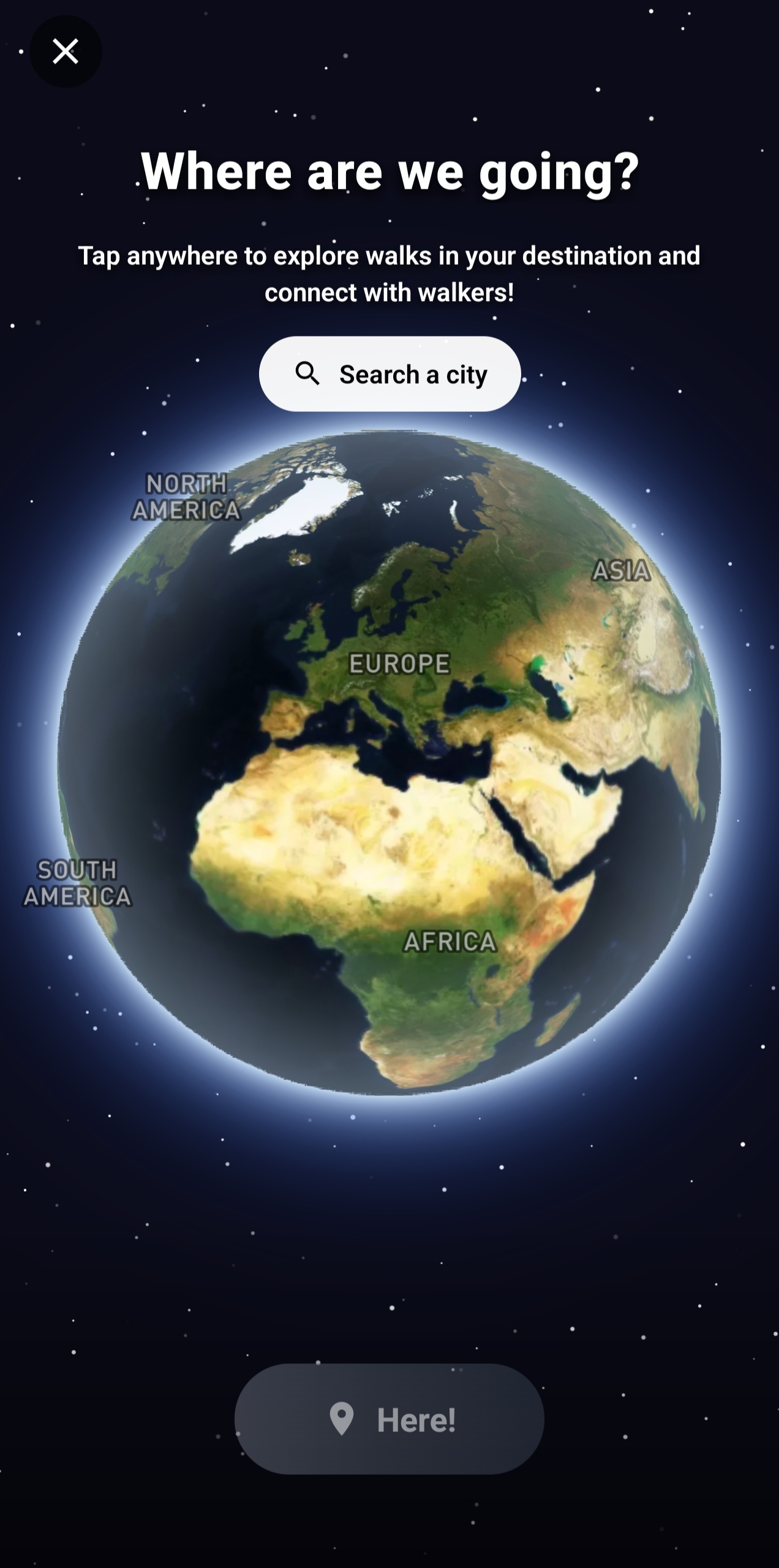 Premium subscribers can now activate Travel Mode to override their GPS location and explore walks happening anywhere in the world. Select a city or drop a pin on the map, and the app shows nearby walks as if you were there.