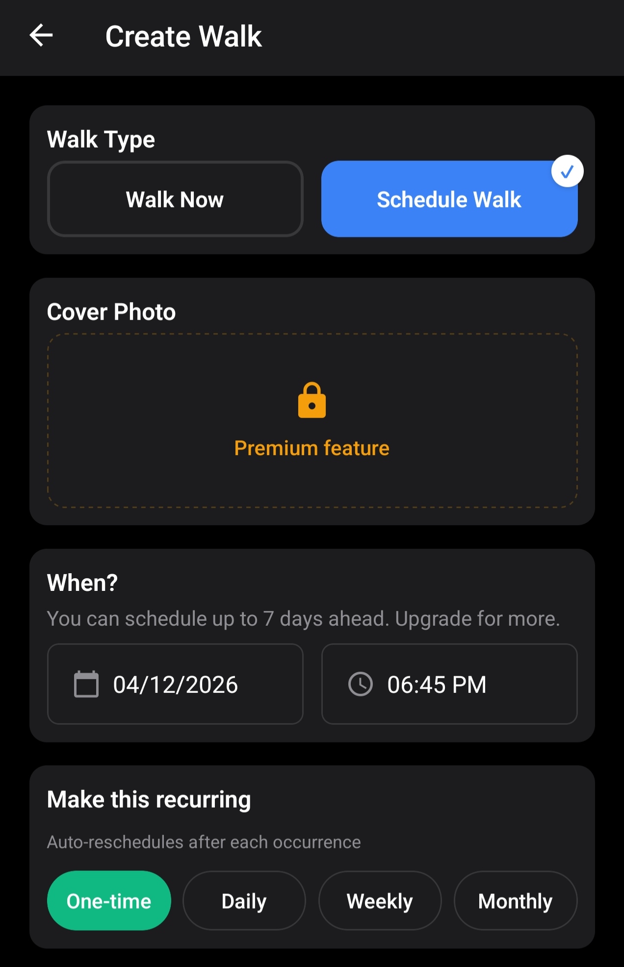 Premium subscribers can upload a cover photo when creating a walk. The photo appears with a gradient overlay on the walk card in Explore and in the walk detail view, making your walk stand out on the map and in listings.