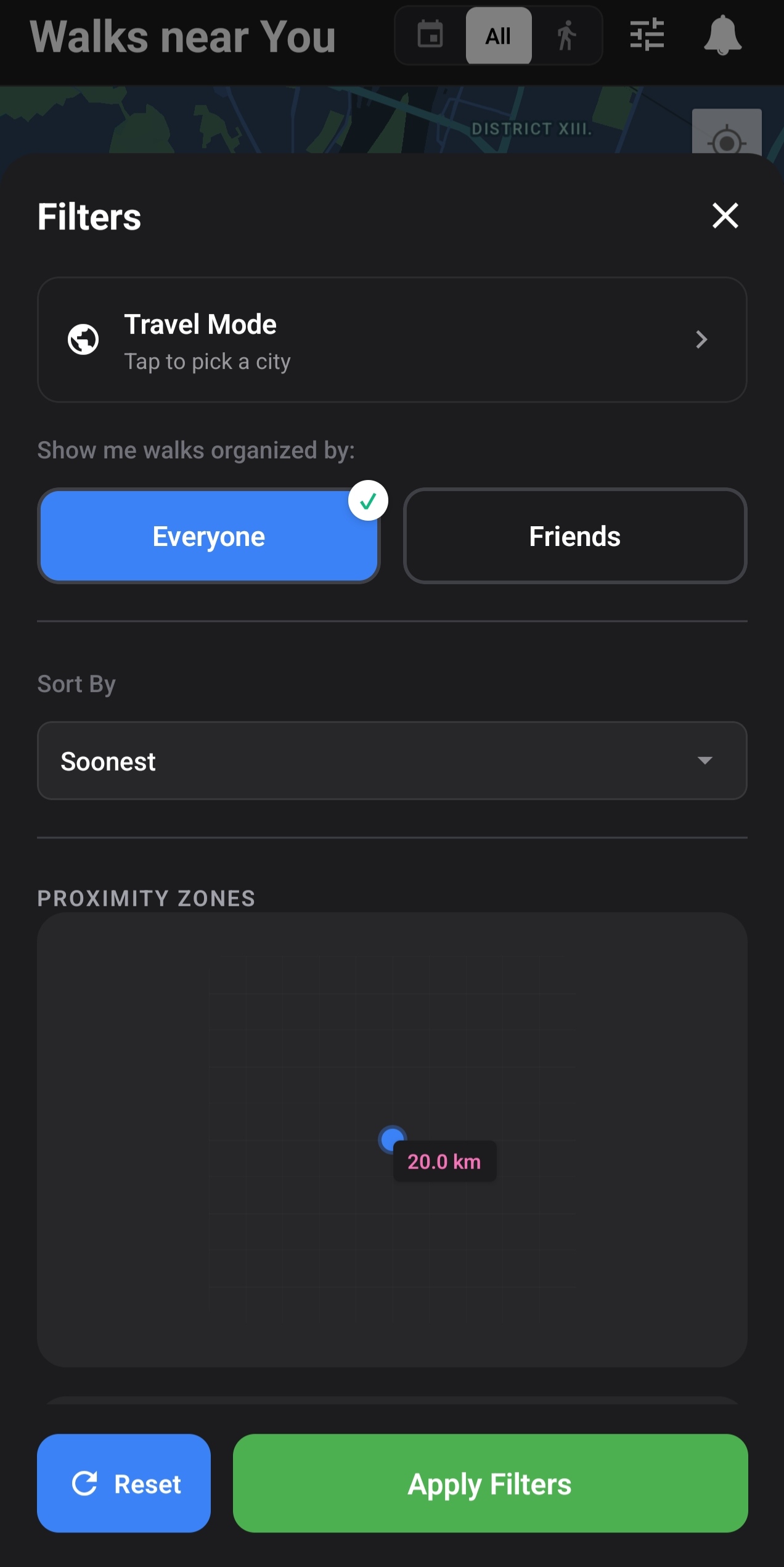 The walk discovery filters received a complete UI overhaul with a cleaner layout, dual-range sliders for participants and duration, and a reset button that respects your tier's default radius.