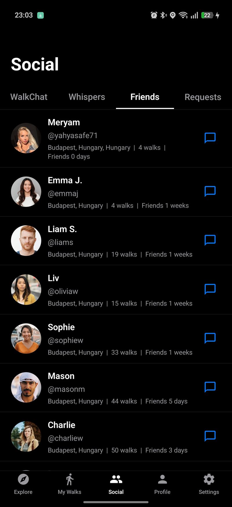 Walk With Me lets you find walkers in your area to make friends and walk together, whether it's hiking, a social stroll, or a fitness walk. Whether you're walking to lose weight or exploring a new city, a walk is always better with company.